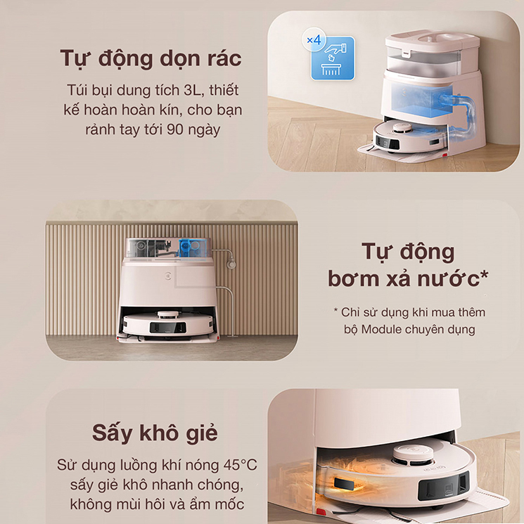 - Giặt giẻ lau bằng nước nóng 70°C - Hút bụi tự động lên túi chứa - Sấy khô giẻ lau bằng khí nóng - Nâng hạ đế lau tự động - Công nghệ lau mở rộng làm sạch cạnh tường |
