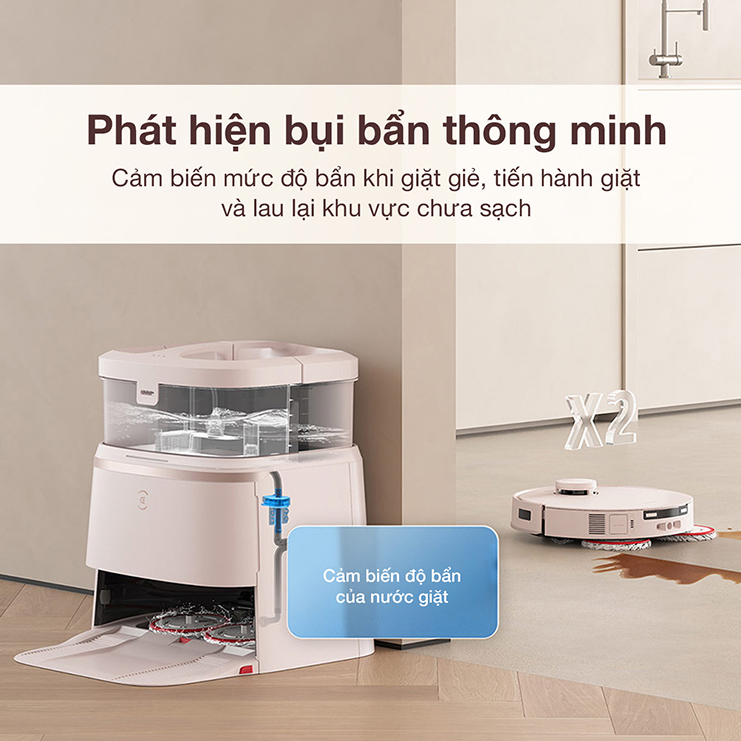 Robot hút bụi Ecovacs T30 Pro Omni tích hợp công nghệ giặt khăn lau bằng nước nóng 70°C giúp loại bỏ vết bẩn và tiệt trùng một cách hiệu quả. Đặc biệt, tính năng này sẽ rất hữu ích trong nhà bếp và phòng ăn để dễ dàng loại bỏ các vết dầu mỡ và những vết bẩn khó nhằn. Trong quá trình làm sạch, robot liên tục cung cấp nước nóng 70°C từ bình chứa, loại bỏ các vết bẩn cứng đầu trên sàn nhà và tiêu diệt vi khuẩn. Đồng thời, nó còn được trang bị hệ thống phát hiện độ bẩn thông minh đảm bảo khu vực bẩn được lau 2 lần nhằm làm sạch tối ưu mà không để lại bất kỳ vết dơ nào trên sàn nhà.