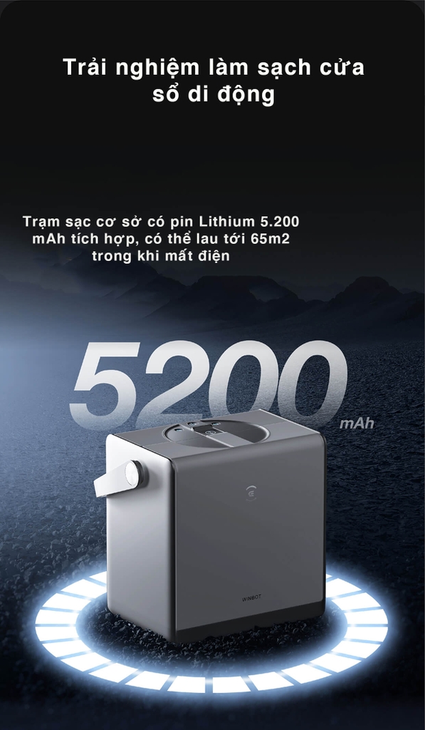 - Trạm sạc di dộng, dễ dàng di chuyển các vị trí lau khác nhau. Trạm sạc cơ sở có pin Lithium 5.200 mAh, có thể lau tới 65m2 trong một lần sạc, không cần lo lắng nếu không có nguồn điện
